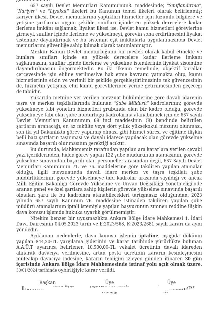 Milli Eğitim Bakanlığı tarafından merkez ve taşra teşkilatlarına 2022 yılında 657 sayılı Devlet Memurları Kanunu'nun 76. maddesine istinaden yapılan şube müdürü atamalarının iptali istemiyle yaptığımız 30.03.2022 tarihli başvurunun zımnen reddine ilişkin işlemin Ankara 15. İdare Mahkemesinin 19.12.2022 tarih ve E:2022/1152, K:2022/3031 sayılı kararıyla iptali üzerine, bu defa 2023 yılında 657 sayılı Devlet Memurları Kanunu'nun 76. maddesine istinaden yapılan şube müdürü atamalarının iptali istemiyle 29.03.2023 tarihli dilekçeyle Milli Eğitim Bakanlığına yaptığımız başvurunun zımnen reddine ilişkin işlemin iptali istemiyle açmış olduğumuz davayı kazanmış bulunmaktayız. İstinaf yolu açık olmak üzere karar 30 gün içerisinde uygulanmak zorundadır. Adalet Mülkün temelidir.