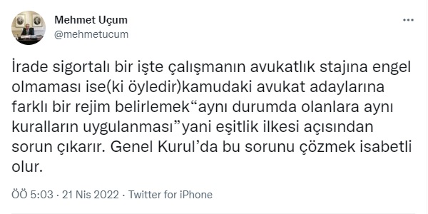 Son olarak Cumhurbaşkanı Başdanışmanı Cumhurbaşkanlığı Hukuk Politikaları Kurulu Başkanvekili Sayın Mehmet UÇUM (@mehmetucum) dün attığı twitle mağdurlara destek olmuş "İrade sigortalı bir işte çalışmanın avukatlık stajına engel olmaması ise(ki öyledir)kamudaki avukat adaylarına farklı bir rejim belirlemek "aynı durumda olanlara aynı kuralların uygulanması ”yani eşitlik ilkesi açısından sorun çıkarır. Genel Kurul’da bu sorunu çözmek isabetli olur." paylaşımında bulunmuştu.