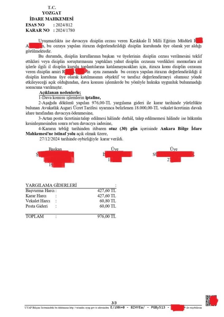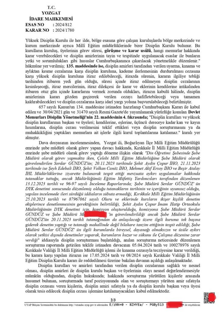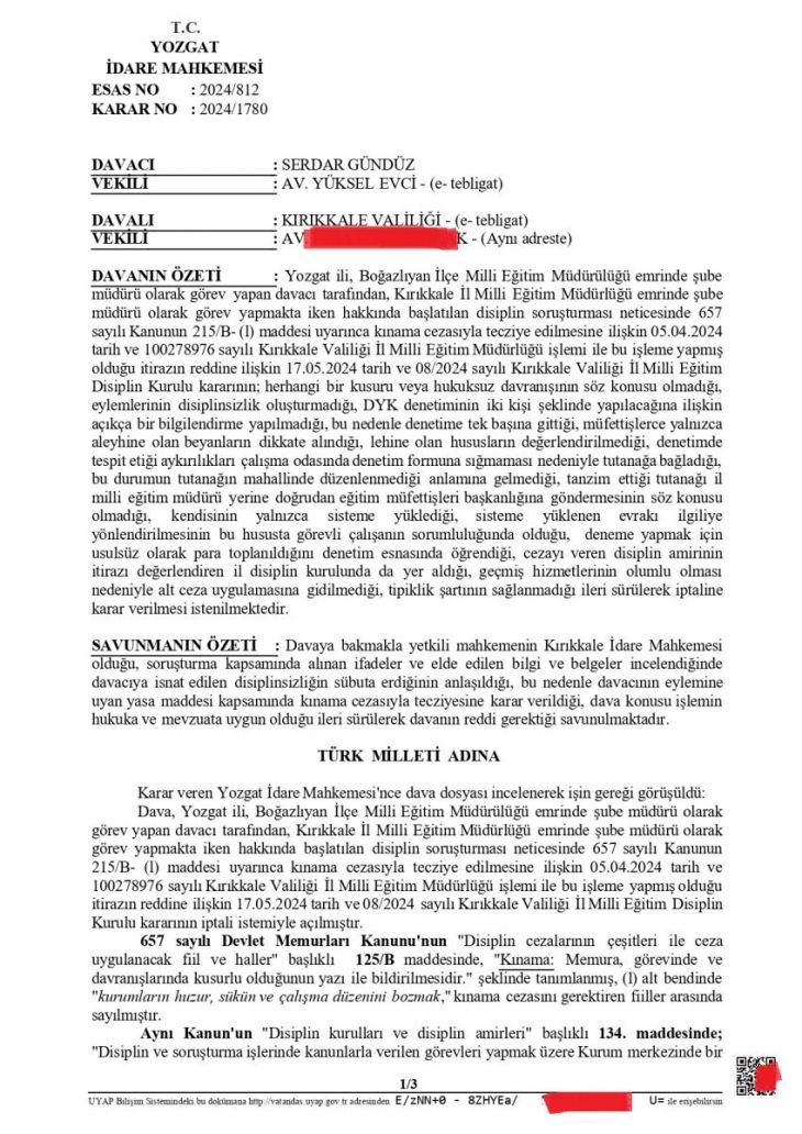 Yozgat İdare Mahkemesinin 2024/1780 sayılı kararı gereğince;