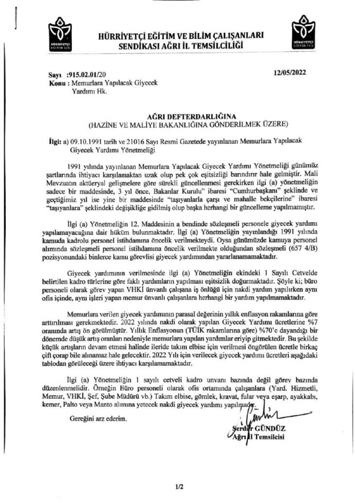 Hürriyetçi Eğitim Sen Ağrı İl Temsilcili olarak Taleplerimizi Hazine ve Maliye Bakanlığı’na ilettiğimiz resmi yazımız;