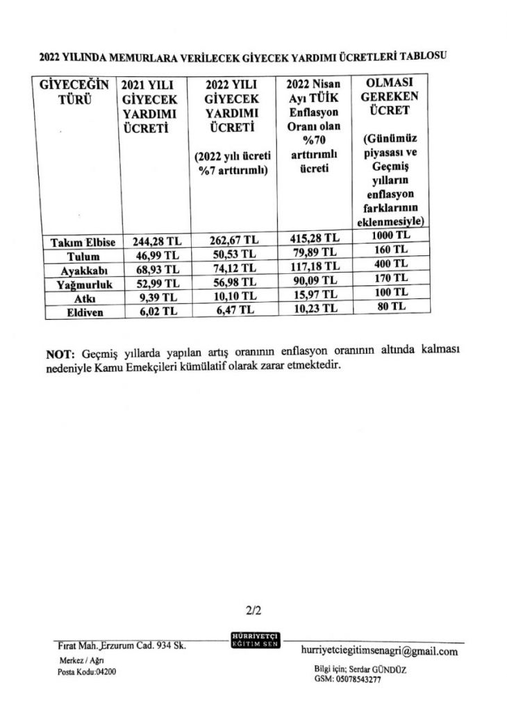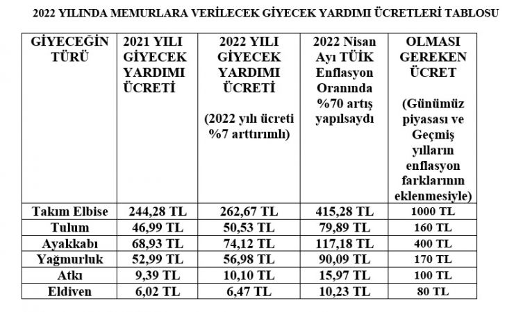 Memurlara verilen giyecek yardımının parasal değerinin yıllık enflasyon rakamlarına göre arttırılması gerekmektedir. 2022 yılında nakdi olarak yapılan Giyecek Yardımı ücretlerine %7 oranında artış ön görülmüştür. Yıllık Enflasyonun (TÜİK rakamlarına göre) %70’e dayandığı bir dönemde düşük artış oranları nedeniyle memurlara yapılan yardımlar eriyip gitmektedir. Bu şekilde küçük artışların devam etmesi halinde ileride takım elbise için verilmesi öngörülen 262,67TL’ye birkaç çift çorap bile alınamaz hale gelecektir. 2022 Yılı için verilecek giyecek yardımı miktarları aşağıdaki tablodan görüleceği üzere ihtiyacı karşılamamaktadır.