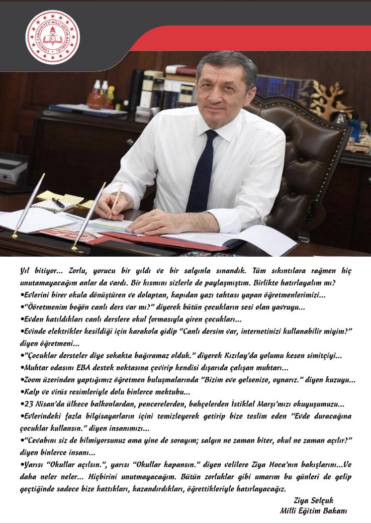 Milli Eğitim Bakanı Prof. Dr. Ziya SELÇUK, 2020 yılı için güzel ve gülümseten bir mesaj yayımladı.