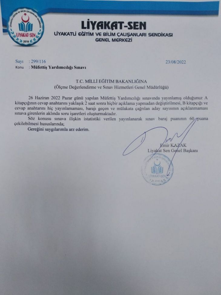 Liyakatli Eğitim ve Bilim Çalışanları Sendikası Genel Merkezi, MEB Ölçme Değerlendirme ve Sınav Hizmetleri Genel Müdürlüğü'ne resmi yazıyla başvurarak; 26 Haziran 2022 Pazar günü yapılan Müfettiş Yardımcılığı sınavıyla ilgili istatistiki bilgilerin kamuoyuyla paylaşılmasını ve sınav baraj puanının 70'ten 60 puana çekilmesi talebinde bulundu. Resmi yazının içeriği şu şekilde: