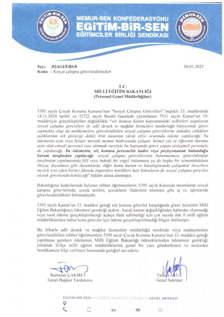Eğitim Bir Sen Açıklamasında : 5395 sayılı Çocuk Koruma Kanunu’nun “Sosyal Çalışma Görevlileri” başlıklı 33. maddesinde 14.11.2024 tarihli ve 32722 sayılı Resmî Gazete’de yayımlanan 7531 sayılı Kanun’un 19. maddesiyle gerçekleştirilen değişiklikle “söz konusu kanun kapsamındaki tedbirleri uygulayan sosyal çalışma görevlileri ile adli destek ve mağdur hizmetleri müdürlüğü bünyesinde görev yapmakta olup da mahkemelere görevlendirilen sosyal çalışma görevlilerine almakta oldukları aylıklarının (ek gösterge dâhil) brüt tutarının yüzde ellisi oranında ödeme yapılacağı; bu ödemenin aynı veya benzer ünvanlı memur kadrosunda çalışan, hizmet yılı ve öğrenim durumu aynı olan emsali personel esas alınmak suretiyle bu kapsamda görev yapan sözleşmeli personele de yapılacağı; bu ödemenin, söz konusu personelin kadro veya pozisyonunun bulunduğu kurum tarafından yapılacağı; sosyal çalışma görevlilerinin bulunmaması, görevin bunlar tarafından yapılmasında fiilî veya hukukî bir engel bulunması ya da başka bir uzmanlık dalına ihtiyaç duyulması gibi durumlarda, diğer kamu kurum ve kuruluşlarında çalışanlar ile serbest meslek icra eden birinci fıkrada öngörülen nitelikleri haiz kimselerin de sosyal çalışma görevlisi olarak görevlendirilebileceği” hüküm altına alınmıştır.