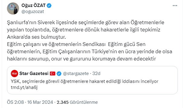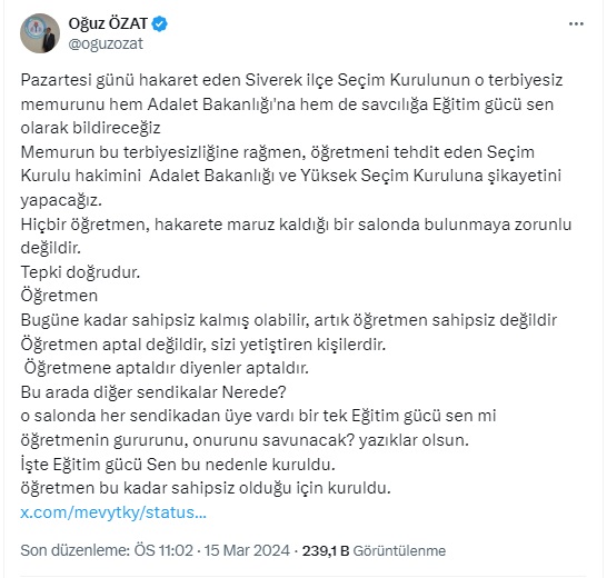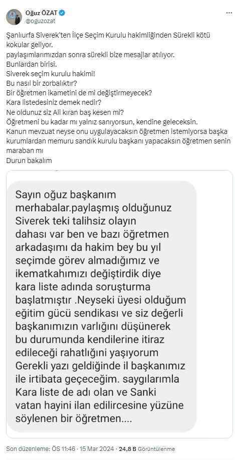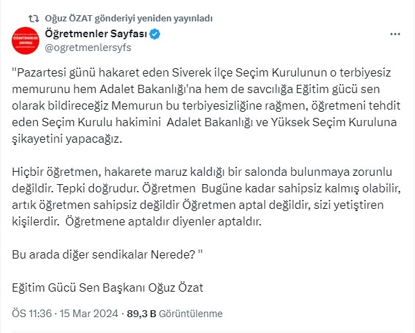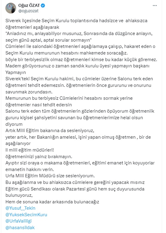 Siverek ilçesinde Seçim Kurulu toplantısında hadsizce ve ahlaksızca öğretmenleri aşağılayarak "Anladınız mı, anlayabiliyor musunuz, Sonrasında da düzgünce anlayın, seçim günü aptal, aptal sorular sormayın" Cümleleri ile salondaki öğretmenleri aşağılamaya çalışıp, hakaret eden o Seçim Kurulu memurunun hesabını mahkemede soracağız. böyle bir terbiyesizlik olmaz öğretmenleri kimse bu kadar küçük göremez. Madem görüyorsunuz o zaman sandık kurulu üyesi yapmayın başkanı Yapmayın Siverek'teki Seçim Kurulu hakimi, bu cümleler üzerine Salonu terk eden öğretmeni tehdit edemezsin. öğretmenlerin önce gururunu ve onurunu savunmak zorundasın. Memurunun bu terbiyesiz Cümlelerini hesabını sormak yerine öğretmenler nasıl tehdit edersin Salonu terk eden tüm öğretmenlerin gözlerinden öpüyorum öğretmenlik gururu kişisel şahsiyetini savunan bu öğretmenlerimize helal olsun diyorum Artık Milli Eğitim bakanına da sesleniyoruz, yeter artık, her Bakanlığın amelesi, işini yapan olmuş öğretmen , bir de aşağılanıyor Il milli eğitim müdürleri! öğretmeninizi yalnız bırakmayın. Ayıptır sizi oraya o makama öğretmenleri, eğitimi emanet için koyuyorlar emanetin hakkını verin. Urfa Milli Eğitim Müdürü size sesleniyorum. Bu aşağılanma ve bu ahlaksızca cümlelere gereğini yapacak mısınız Eğitim gücü Sendikası olarak Pazartesi günü hem suç duyurusunda bulunuyoruz, Hem de sonuna kadar arkasında bulunacağız.