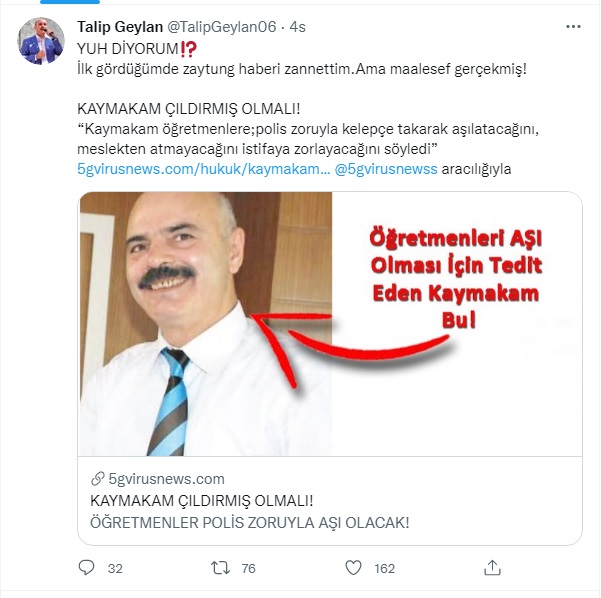 Haber merkezimize, Kocaeli Başiskele Kaymakamı Necip ÇAKMAK’ın öğretmenleri aşı olması için tehdit etiği haberi geldi.