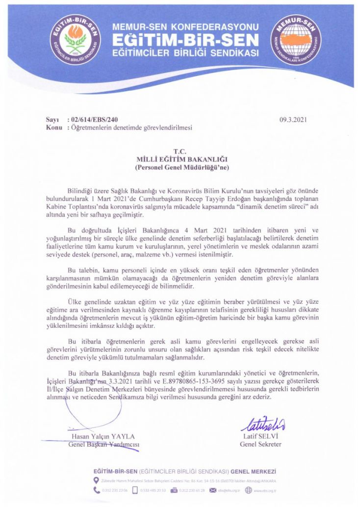 Eğitim-Bir-Sen olarak, Millî Eğitim Bakanlığı’na başvurarak, Bakanlığa bağlı resmî eğitim kurumlarındaki yönetici ve öğretmenlerin, İçişleri Bakanlığı’nın 3.3.2021 tarihli ve E.89780865-153-3695 sayılı yazısı gerekçe gösterilerek, İl/İlçe Salgın Denetim Merkezleri bünyesinde denetim göreviyle yükümlü tutulmamalarını talep ettik.