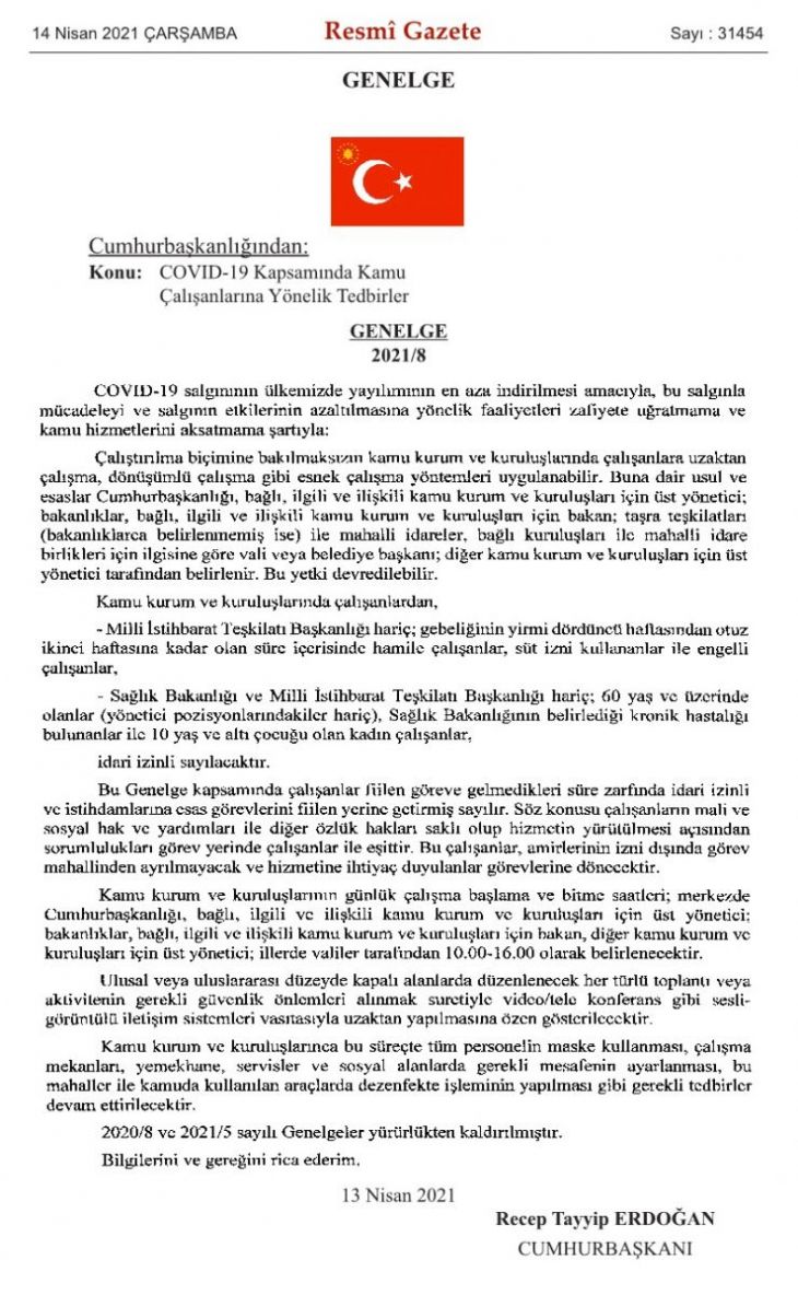 Bilindiği gibi Cumhurbaşkanlığımızca 14 Nisan 2021 tarihli ve 31454 sayılı Resmi Gazete'de Covid-19 Kapsamında Kamu Çalışanlarına Yönelik Tedbirler konulu genelge yayımlanmıştır.