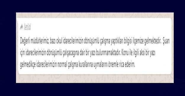 Fakat Samsun ili İlkadım İlçe Milli Eğitim Müdürlüğü Cumhurbaşkanlığı genelgesini anlamamış olacak ki okul müdürlerinin wp grubuna attığı mesajda " değerli okul müdürlerimiz bazı okul idarecilerimizin dönüşümlü çalışma yaptıkları bilgisi ilçemize gelmektedir. Şuan için idarecilerimizin dönüşümlü çalışacağına dair bir yazı bulunmamaktadır. Konu ile ilgili aksi bir yazı gelmedikçe idarecilerimizin normal çalışma kurallarına uymalarını önemle rica ederim"  demektedir.