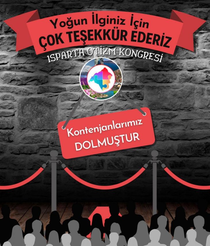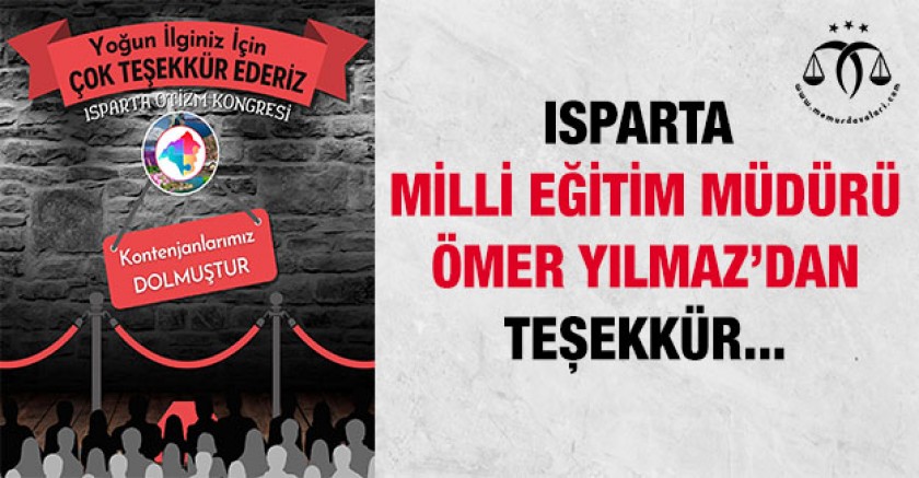Isparta İl Milli Eğiitm Müdürü Ömer YILMAZ bugün "Isparta Otizm Konresi'ne" yoğun ilgi gösterildiğini ve kısa sürede kontenjanın dolduğunu kamuoyuna duyurarak teşekkür mesajı yayınladı.