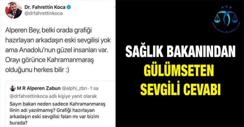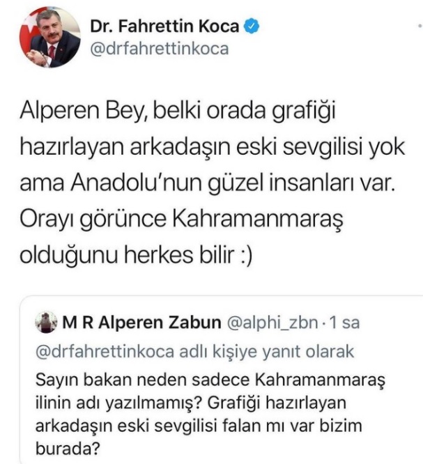 Sosyal medya kullanıcısının Tweetini alıntılayan Koca, ''Alperen Bey, belki orada grafiği hazırlayan arkadaşın eski sevgilisi yok ama Anadolu'nun güzel insanları var. Orayı görünce Kahramanmaraş olduğunu herkes bilir'' ifadelerini kullandı.