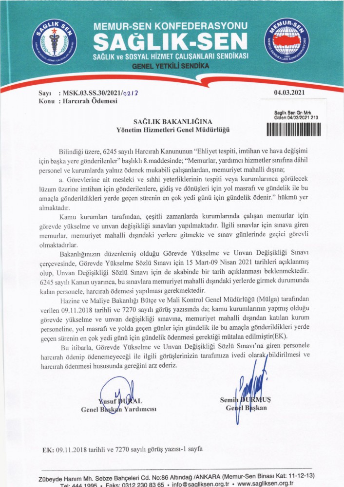 Sağlık-Sen Genel Başkanı Semih Durmuş ve Genel Başkan Yardımcısı Yusuf Dural imzalı başvuru metninde, Hazine ve Maliye Bakanlığı’nın yazısının emsal alınarak Görevde Yükselme ve Unvan Değişikliği sözlü sınavlarına girecek sağlık çalışanlarına yol harcırahı ödenmesi istendi.