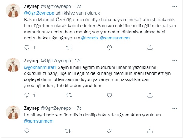 Bu kadar mı zor o birimin çalışanlarının görev yerini değiştirmek ve başka birime vermek? Orada İlçe Müdürü yok mu? Şube müdürü yok mu? Yok, eğer varsa bir şef nasıl olurda bırakın bir öğretmeni bir insana bu sözleri kullanıp tehdit edebilir? Mobbing uygulayabilir?