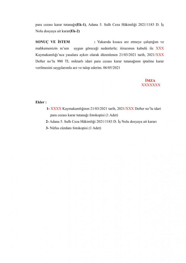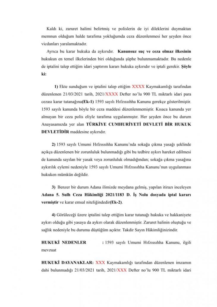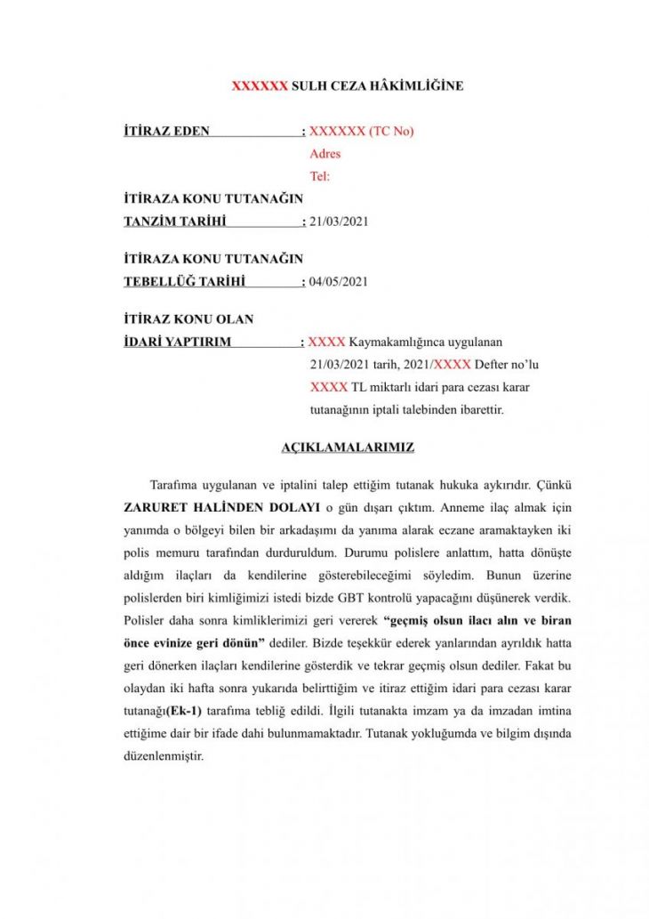 Yazımızda sokağa çıkma nedeniyle ceza kesilen vatandaşlarımız için örnek BİR dilekçe sunduk. Bu durumda olanlar ilgili dilekçe de ufak değişiklikler yaparak(kırmızı yazılı bölgeleri) itirazda bulunabilirler.