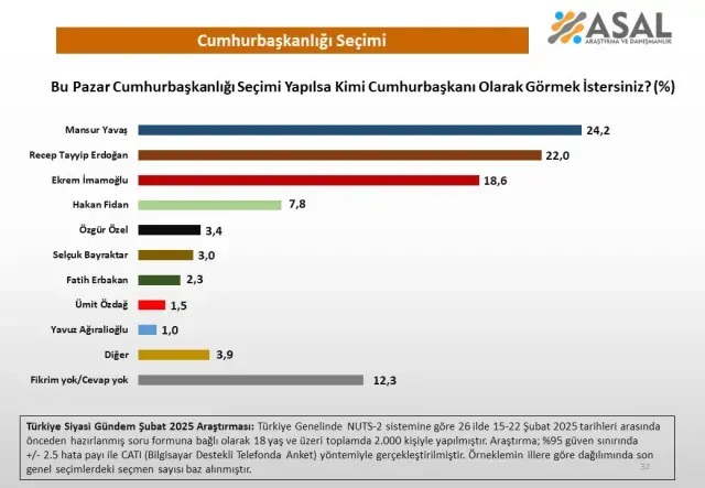 Cumhurbaşkanı Erdoğan'ın bir kez daha aday olması durumunda karşısında muhalefetin öne çıkan iki ismi Mansur Yavaş ile Ekrem İmamoğlu'nun oy oranı ölçüldü. Mansur Yavaş'ın Erdoğan'ı geçtiği görüldü. Yüzde 22 Recep Tayyip Erdoğan, yüzde 24.2 Mansur Yavaş, yüzde 18.6 ise Ekrem İmamoğlu yanıtını verdi.