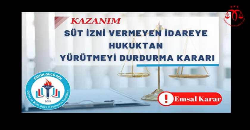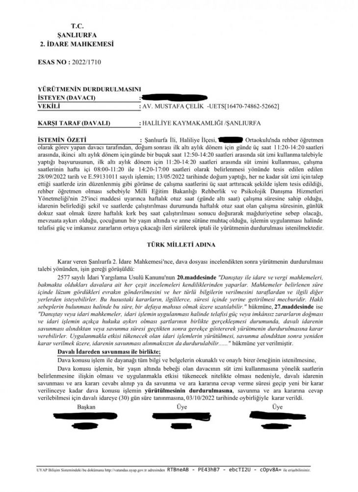 Şanlıurfa-Haliliye ilçesinde Rehber Öğretmen/Psikolojik Danışman olarak görev yapan üyemiz tarafından, doğum sonrası ilk altı aylık dönem için günde üç saat 11:20-14:20 saatleri arasında, ikinci altı aylık dönem için günde bir buçuk saat 12:50-14:20 saatleri arasında süt izni kullanma talebiyle yaptığı başvurusu, ilk altı aylık dönem için 11:20-14:20 saatleri arasında süt iznini kullanması, çalışma saatlerinin hafta içi 08:00-11:20 ile 14:20-17:00 saatleri olarak belirlenmesi yönünde tesis edilmiştir.