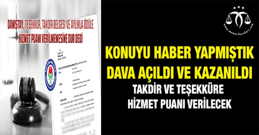Danıştay 2. Dairesi, kararında, “657 sayılı Devlet Memurları Kanunu’nda 6111 sayılı Kanun ile değişiklik yapılmadan önce alınan teşekkür belgesi, takdir belgesi ve aylıkla ödülün; başarı belgesi, üstün başarı belgesi ve ödül ile benzer nitelikte bulunduğu, teşekkür belgesi, takdir belgesi ve aylıkla ödül alan öğretmenlerin halen görev yapmakta olduğu hususları dikkate alındığında; başarı belgesi, üstün başarı belgesi ve ödül alan öğretmenlere ek hizmet puanı verilmesinin yanında, teşekkür belgesi, takdir belgesi ve aylıkla ödül alan öğretmenler için ek hizmet puanı verilmemesine yönelik eksik düzenlemede hukuka uyarlık görülmemiştir” gerekçesine yer verdi.