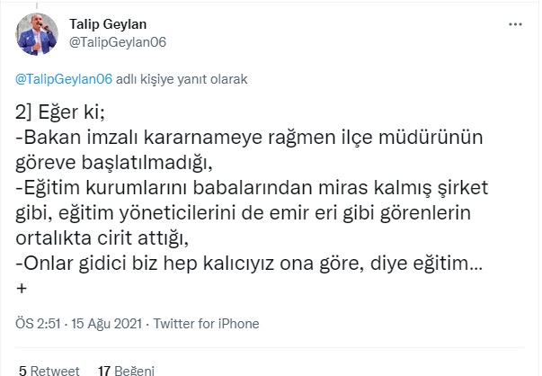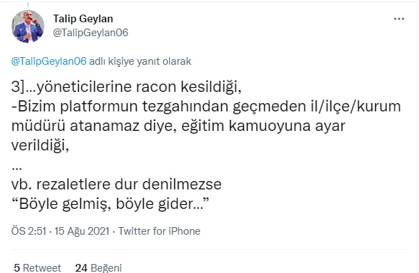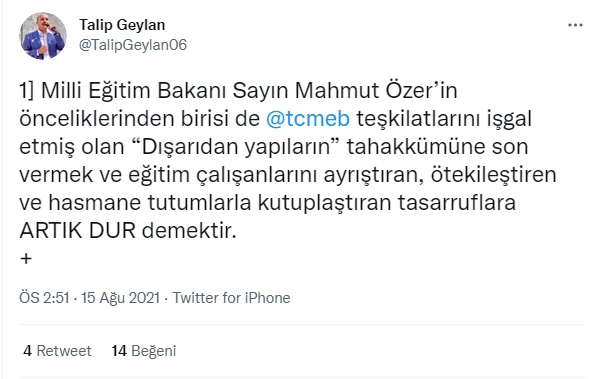 Yarın bir gün okul müdürü öğretmeni göreve başlatmaz, ilçe müdürü müdür yardımcısını göreve başlatmaz bu genele sirayet eder. Bu durum çok vahimdir. Bu yüzden bu isimler kamuoyuna açıklanmalıdır ve devletin gücü gösterilmelidir. İşte Talip Geylan'ın paylaşımları: