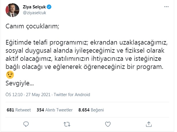 Milli Eğitim Bakanı Prof. Dr. Ziya SELÇUK telafi programıyla ilgili detayları twitter adresinden paylaştı. İşte o paylaşım