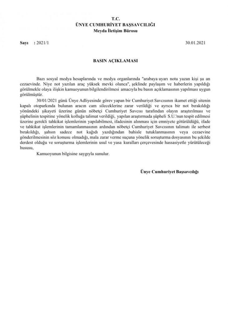 Bazı sosyal medya hesaplarında ve medya organlarında ''arabaya uyarı notu yazan kişi şu an cezaevinde. Niye not yazılan araç yüksek mevki olunca'', şeklinde paylaşım ve haberlerin yapıldığı görülmekle olaya ilişkin kamuoyunun bilgilendirilmesi amacıyla bu basın açıklamasının yapılması uygun görülmüştür. 30/01/2021 günü Ünye Adliyesinde görev yapan bir Cumhuriyet Savcısının ikamet ettiği sitenin kapalı otoparkında bulunan aracın cam sileceklerine zarar verildiği ve ayrıca bir not bırakıldığı yönündeki şikayeti üzerine günün nöbetçi Cumhuriyet Savcısı tarafından olayın araştırılması ve şüphelinin tespitine yönelik kolluğa talimat verildiği, yapılan araştırmada şüpheli S.U.'nun tespit edilmesi üzerine gerekli tahkikat işlemlerinin yapılabilmesi, ifadesinin alınması için emniyete götürüldüğü, ifade ve tahkikat işlemlerinin tamamlanmasının ardından nöbetçi Cumhuriyet Savcısının talimatı ile serbest bırakıldığı, şahsın sadece not kağıdı yazdığından bahisle tutuklanmasının veya cezaevine gönderilmesinin söz konusu olmadığı, mala zarar verme suçuna yönelik soruşturma dosyasının bu şekilde derdest olduğu ve soruşturma işlemlerinin usul ve yasa kuralları çerçevesinde hassasiyetle yürütüleceği hususu, Kamuoyunun bilgisine saygıyla sunulur.