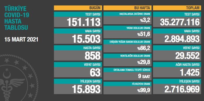Sağlık Bakanlığı, Türkiye'nin Günlük Koronavirüs Tablosu'nu paylaştı. 15 Mart'ta açıklanan son 24 saatlik verilere göre; 858'i semptomatik olmak üzere toplam 15 bin 503 yeni vaka tespit edildi. Vefat sayısı ise 63 olarak kayıtlara geçti. Böylece Türkiye'de koronavirüs nedeniyle hayatını kaybedenlerin sayısı 29 bin 552'ye, toplam vaka sayısı ise 2 milyon 894 bin 893'e yükseldi.