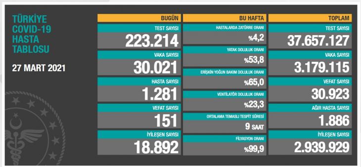 Ülkemizdeki koronavirüs vaka sayısı düne göre arttı. 27 Mart tarihinde açıklanan 24 saatlik verilere göre; 1281'i semptomatik olmak üzere 30 bin 21 yeni vaka tespit edildi. Vaka sayısı son olarak 28 Kasım'da 30 bini geçmişti. Böylece toplam vaka sayısı 3 milyon 179 bin 115'e yükseldi. Vefat sayısı 151 olarak kayıtlara geçti. İyileşen sayısı ise bugün 18 bin 892 oldu.