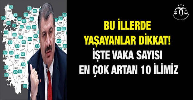 Bakan Koca'nın paylaştığı haritaya göre vaka yoğunluğu bir önceki haftaya göre en çok artan 10 ilimiz; Elazığ, Uşak, Iğdır, Tokat, Kırklareli, Rize, Kırıkkale, Isparta, Bayburt ve Manisa oldu. Zirvedeki il Kırklareli olurken vaka sayısının en az arttığı ilimiz ise Van oldu.