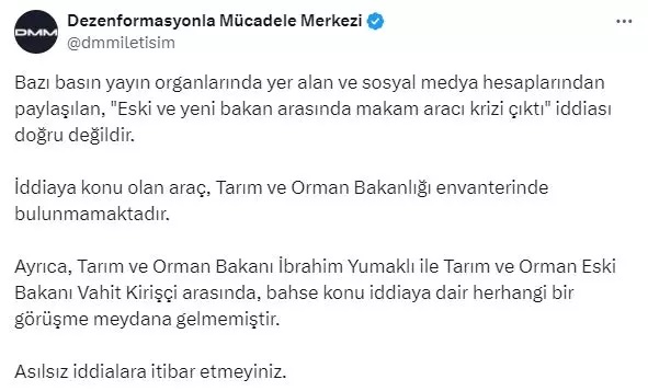 Yapılan açıklamada "Bazı basın yayın organlarında yer alan ve sosyal medya hesaplarından paylaşılan, 'Eski ve yeni bakan arasında makam aracı krizi çıktı' iddiası doğru değildir. İddiaya konu olan araç, Tarım ve Orman Bakanlığı envanterinde bulunmamaktadır. Ayrıca, Tarım ve Orman Bakanı İbrahim Yumaklı ile Tarım ve Orman Eski Bakanı Vahit Kirişçi arasında, bahse konu iddiaya dair herhangi bir görüşme meydana gelmemiştir. Asılsız iddialara itibar etmeyiniz" denildi.