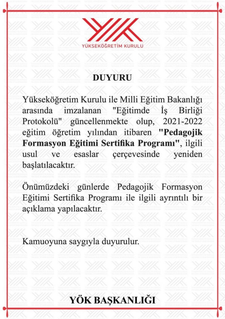 YÖK bugün formasyon vereceği konusunda duyuru yaptı.