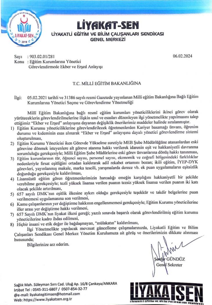 05.02.2021 tarihli ve 31386 sayılı resmi Gazetede yayınlanan Milli eğitim Bakanlığına Bağlı Eğitim Kurumlarına Yönetici Seçme ve Görevlendirme Yönetmeliğinde yapılacak mevzuat güncelleme çalışmalarınızda, Liyakatli Eğitim ve Bilim Çalışanları Sendikası Genel Merkez Yönetim Kurulumuza ait görüş ve önerilerimizin dikkate alınması talep ediyoruz.