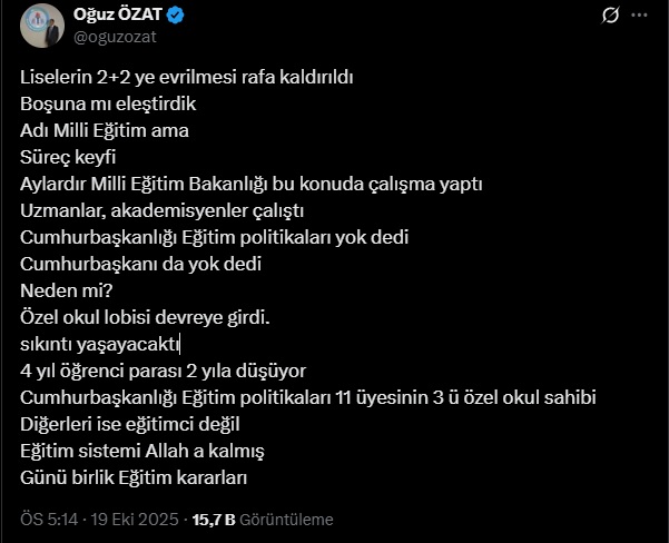 Türkiye’de eğitim sistemi yıllardır reformlarla şekillenmeye çalışılıyor. Son olarak liselerde “2+2” ya da “3+1” gibi modeller gündeme geldi, ancak bu öneriler rafa kaldırıldı. Oğuz Özat’ın sosyal medyada paylaştığı çarpıcı iddialar, eğitim politikalarının bilimsel değil, lobiler ve çıkar çevreleri tarafından yönlendirildiğini belirtiyor. Peki, asıl soru şu: Zorunlu eğitim gerçekten gerekli mi? Yoksa artık kalkmalı mı? İşte Eğitim Gücü Sen Genel Başkanı Oğuz ÖZAT'ın X paylaşımı. Takdir kamuoyunun...